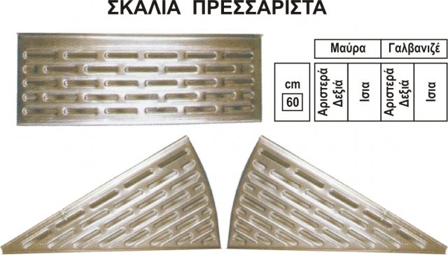 Σκαλοπάτια πρεσσαριστά, Σκαλοπάτια λαμαρίνας. Σκαλοπάτια σχάρες. Στην εταιρεία μας θα βρείτε βιομηχανικά σκαλοπάτια τριγωνικά για στρογγυλές σκάλες ή για ευθεία σκάλα, σκαλοπάτια διάτρητα, σκαλοπάτια από λαμάκι, σκαλοπάτια με σχάρα από την Art Metal.